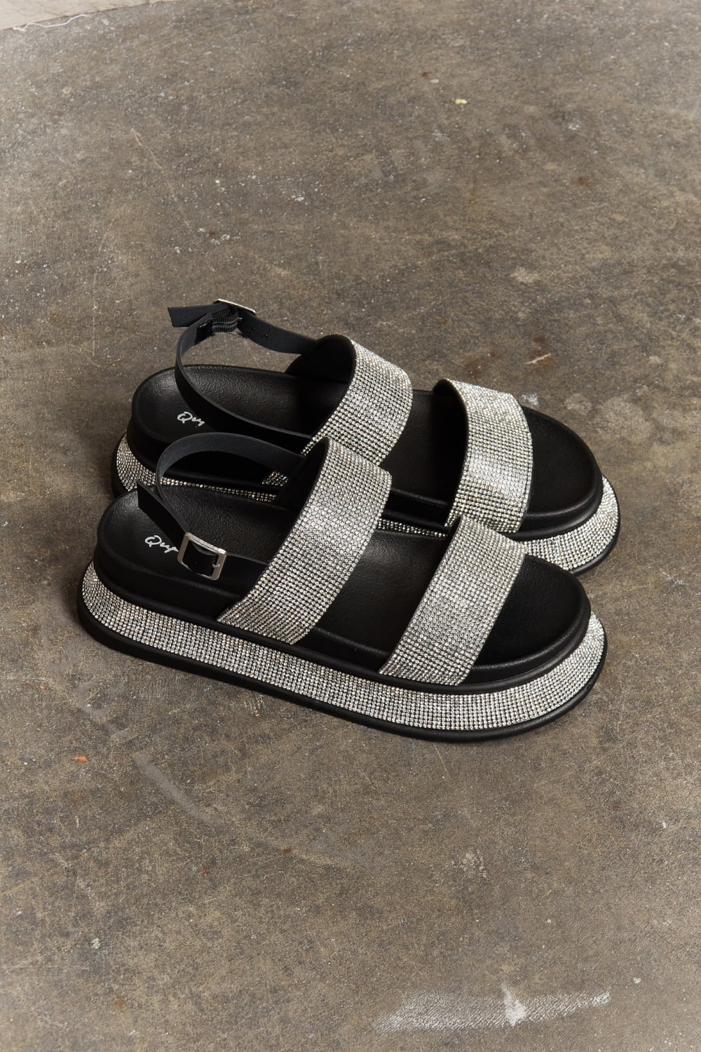 Elevate your footwear game with this dazzling flatform style, designed to add a touch of glamour to any outfit. The two bands of shimmering rhinestones create a captivating sparkle that will catch everyone's eye as you walk. With a secure and comfortable fit, thanks to the slingback strap, you can confidently step out in style all day long. Embrace the elegance and radiance of these sandals, perfect for any occasion where you want to shine and stand out from the crowd.